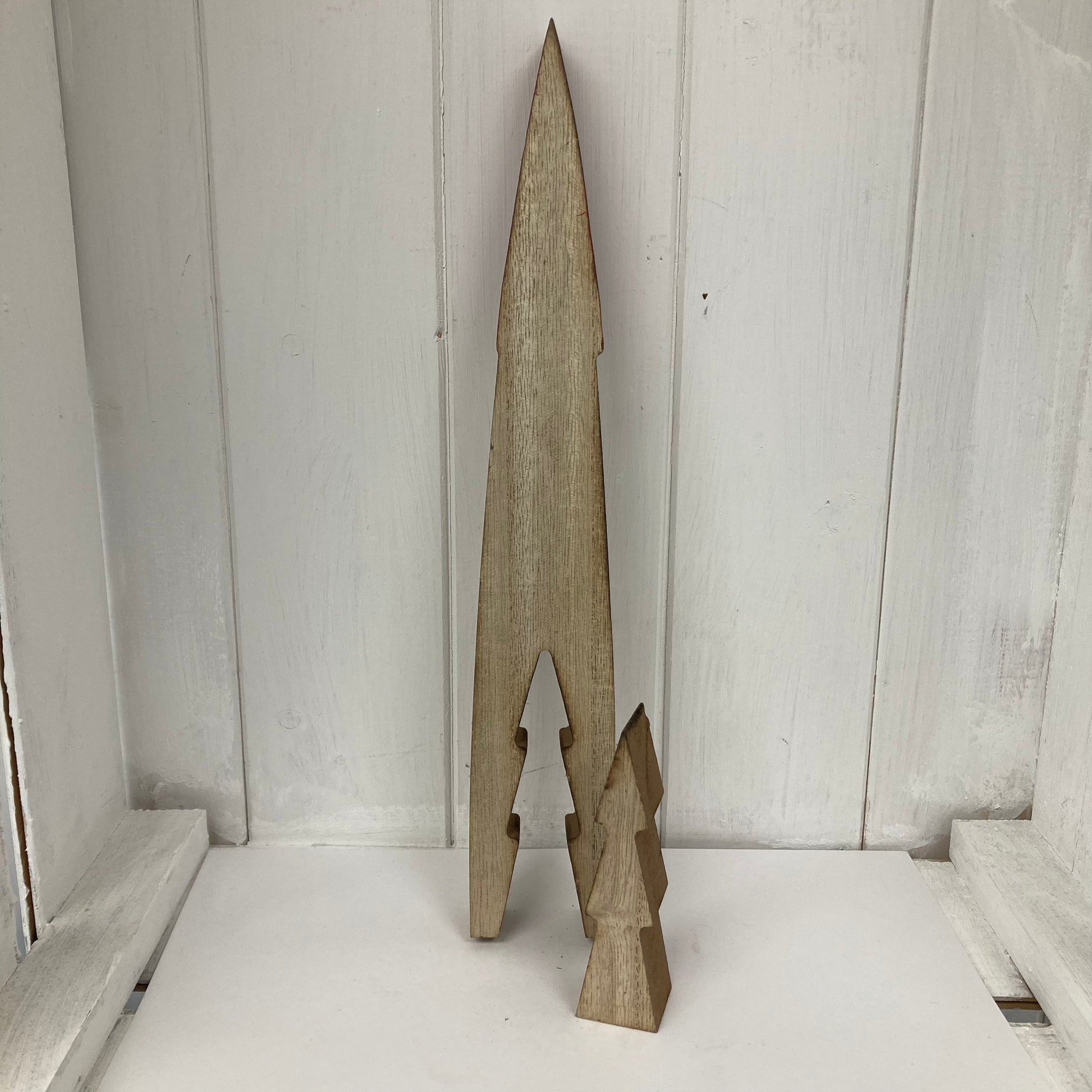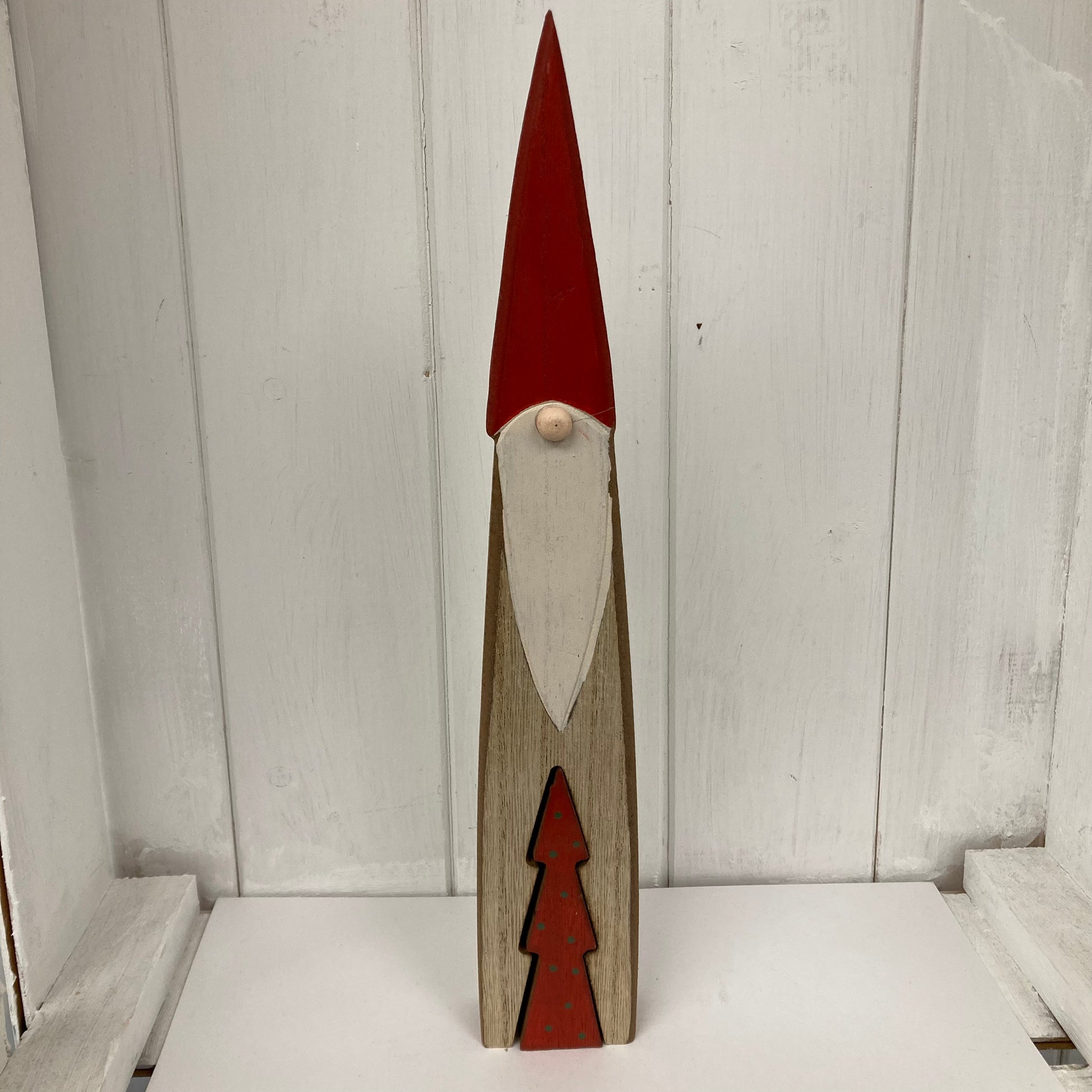 A simplistic carved wooden santa with a tree that pulls out. Painted on one side only.