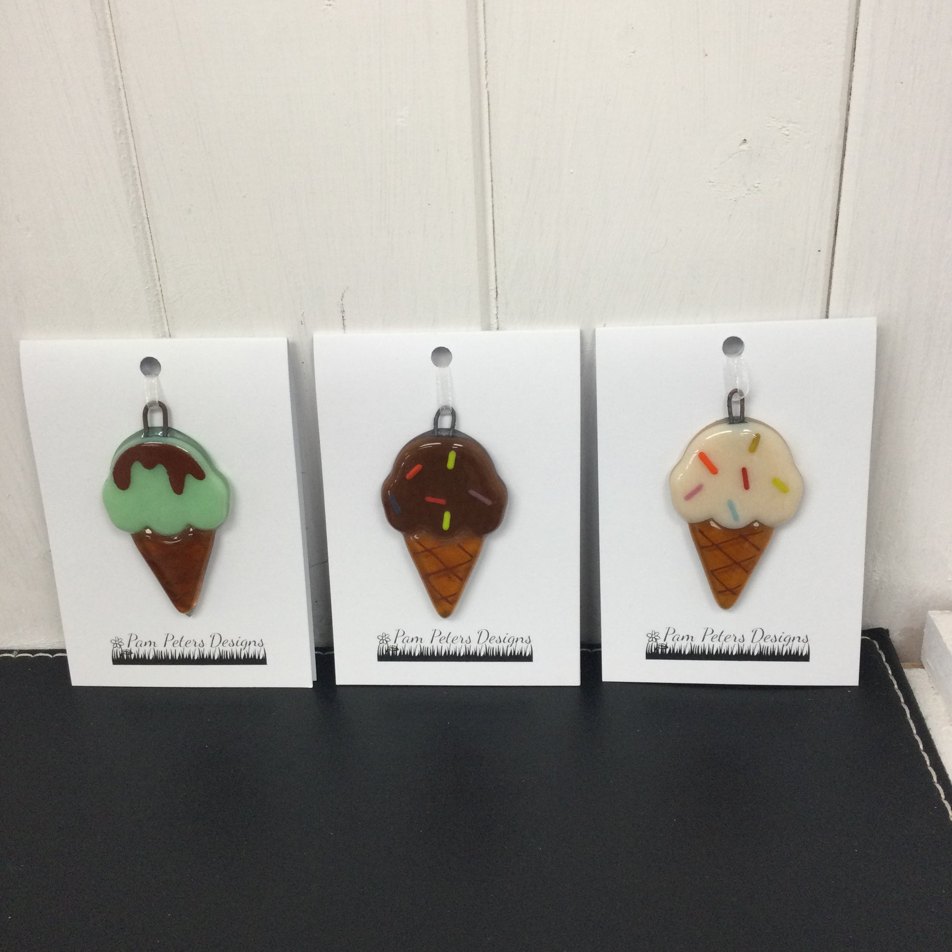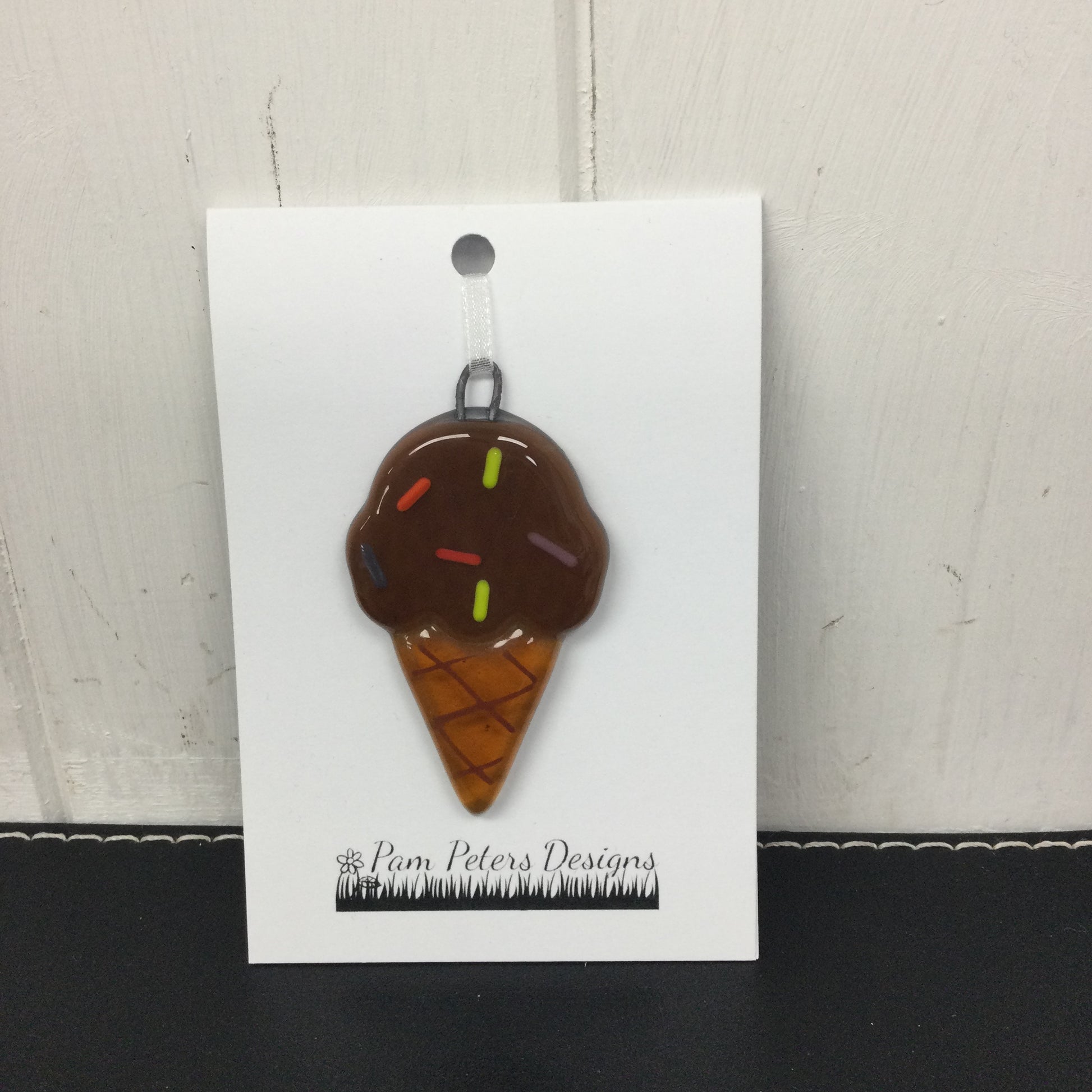 Handmade fused glass ice cream hanging decoration. Hand crafted in North Wales by Pam Peters