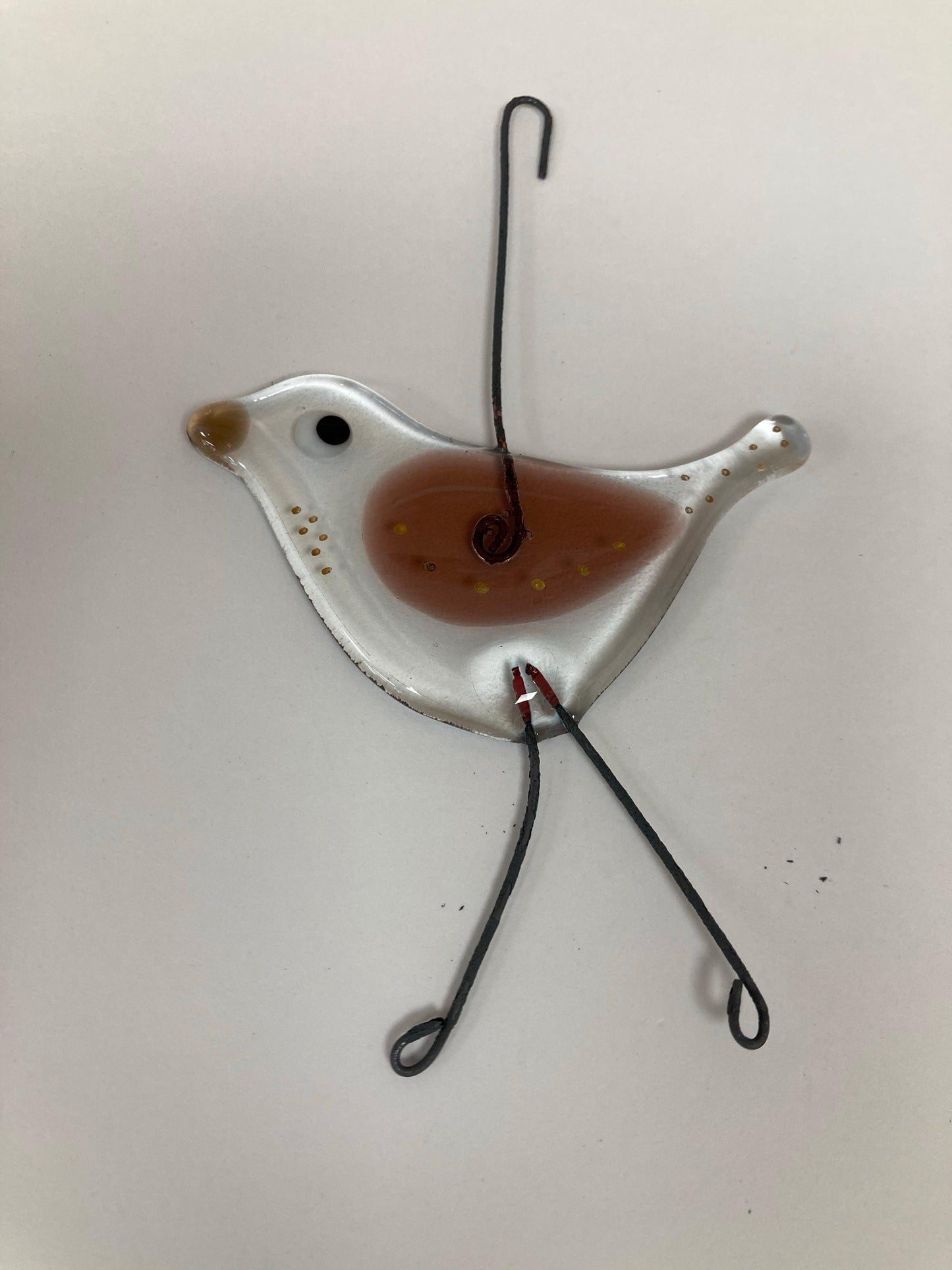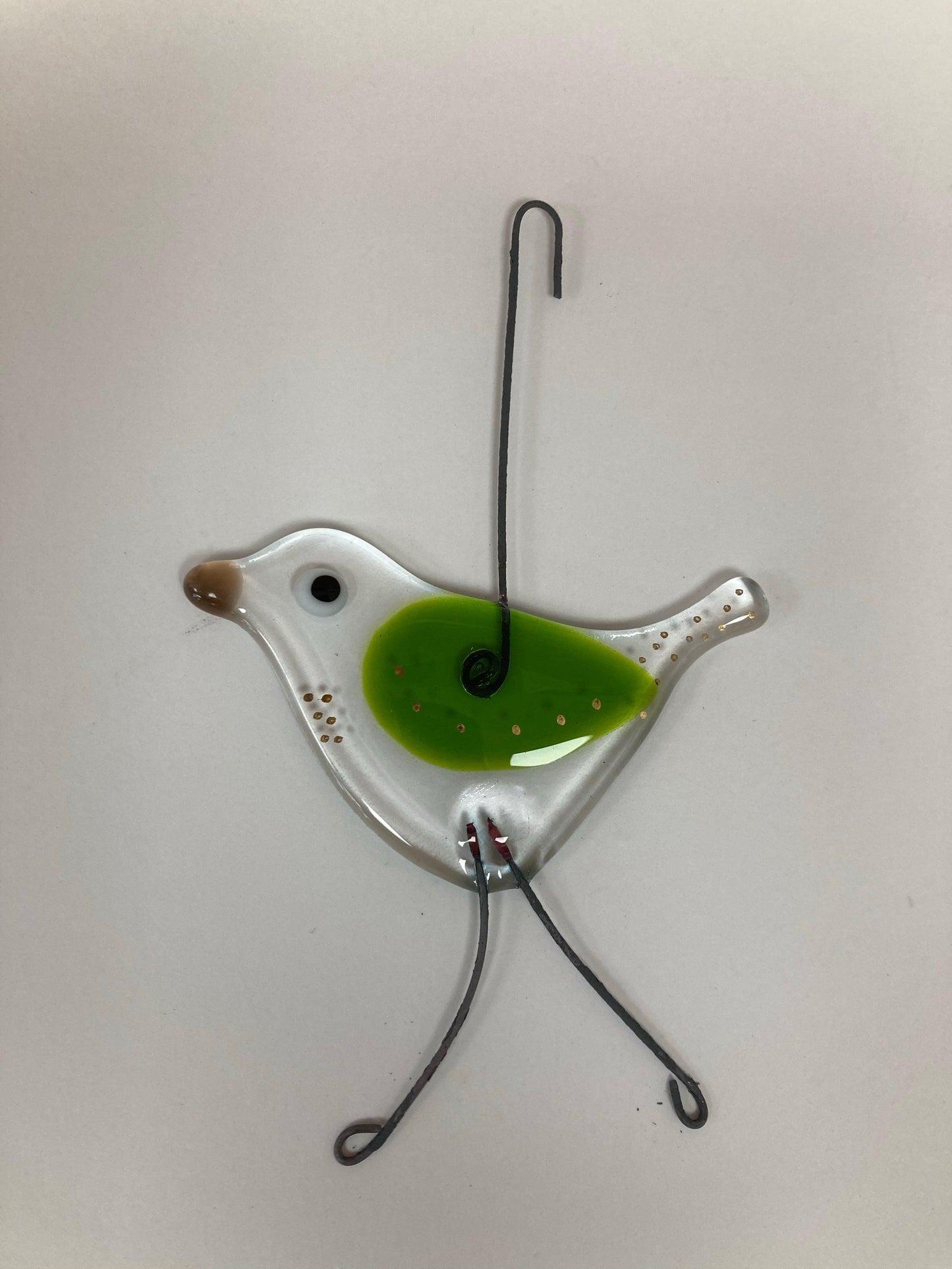 A fused glass, hanging bird designed and made by local artist Fran Brown.